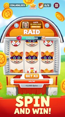 Collect spins and raids and increase your chance of getting rich by plundering and looting their treasures and coins to become the best Fortune GO player in this casual slot machine game.