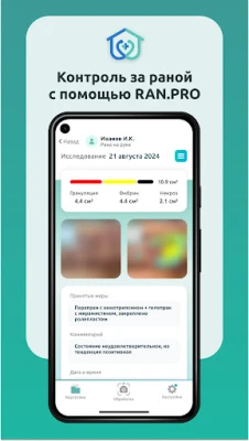 RAN.PRO - мобильное приложение для оценки течения раневого процесса по фотографиям. Приложение быстро и точно рассчитывает структурные элементы раны: некроз, фибрин и грануляции.