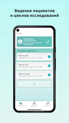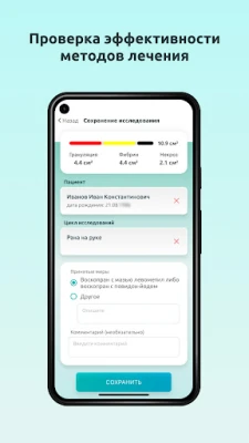 Приложение позволяет вести карточку пациентов, где отображаются результаты отдельных исследований и общая динамика заживления. На каждом этапе даются предложения по выбору местных средств лечения.