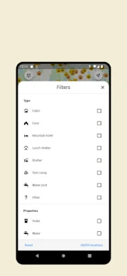 The map view allows you to easily search for shelters, campsites, huts, caves and more in your desired location. You can filter your search results by amenities like drinking water, fire pits, and toilets.