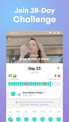 Pick from the curated list of 28-day challenges. Challenges are healthy habits that guide you along the way! It might be everyday exercise, stretching, drinking water, or eating healthy. It's up to you to pick the ideal habit and set the difficulty.